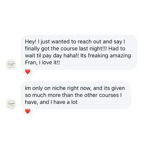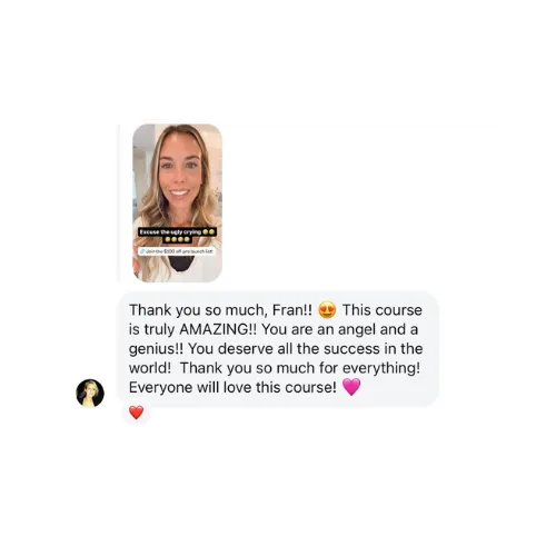 Don't keep waiting on the sidelines with this course! Take the scary leap to dive in because this course will walk you through STEP-BY-STEP everything you need to know/do to START YOUR ONLINE BUSINESS or scale an existing one. Fran did an amazing job making the content easy to follow along with and super relatable. She shares tips & tricks she's learned along her digital marketing journey and seeing how she started from zero & how much she's achieved.