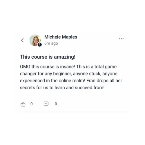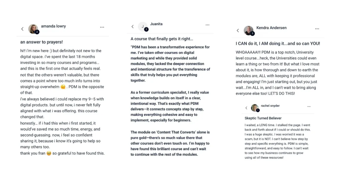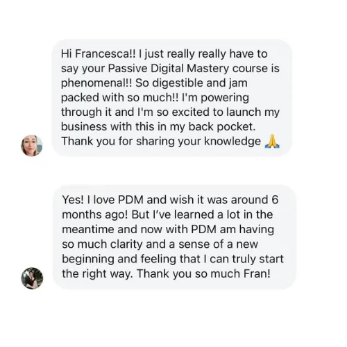 I recently completed the Passive Digital Mastery course, and it was amazing! After purchasing several other courses and falling for the $7 courses that lead to $2500 upsells, I finally found Fran and this incredible program. None of the other popular courses I tried come close to the value and knowledge provided by PDM. Thank you, Fran, for sharing all your expertise and creating such an impactful course!